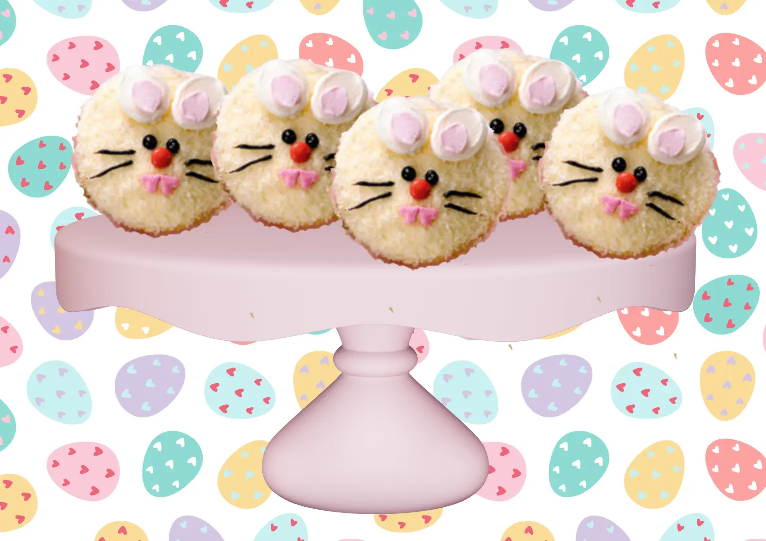 Cut pink mini marshmallows in half. Place on the cut sides of the remaining white marshmallows to make ears. Place on the remaining cupcakes. Decorate with the red coloured mini m&ms for noses and heart sprinkles for teeth. Decorate with the writing icing for eyes and whiskers.