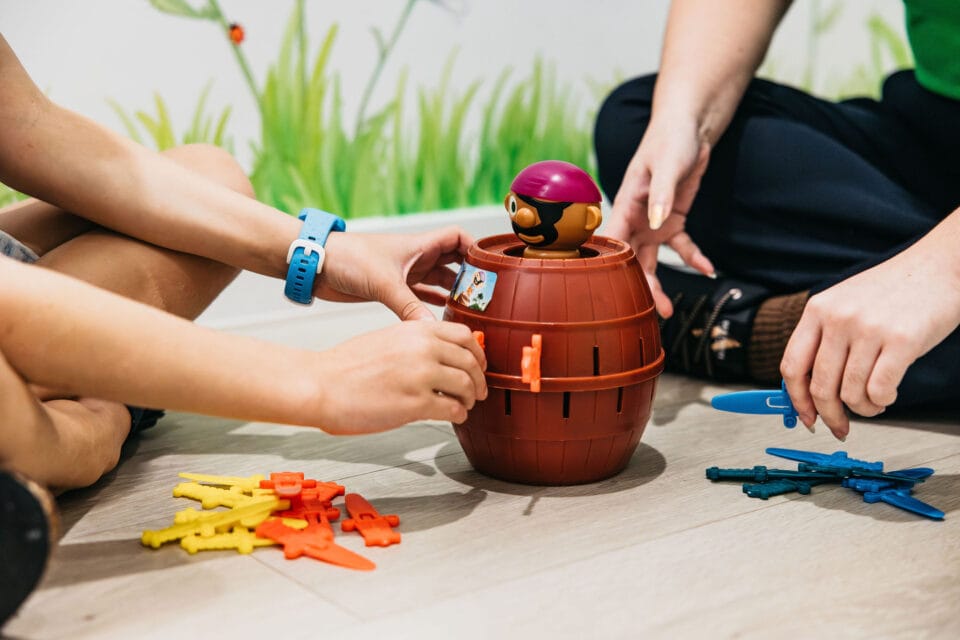 The Pop-Up Pirate game is an engaging activity where players take turns inserting swords into a barrel, leading to the surprise of a pirate figure popping out unexpectedly. This game not only fosters vocabulary building, following directions, and turn-taking but also enhances fine motor skills, hand-eye coordination, and emotional regulation. As children interact with the game, they develop essential social communication skills and cognitive abilities, making it a versatile tool for both play and learning.